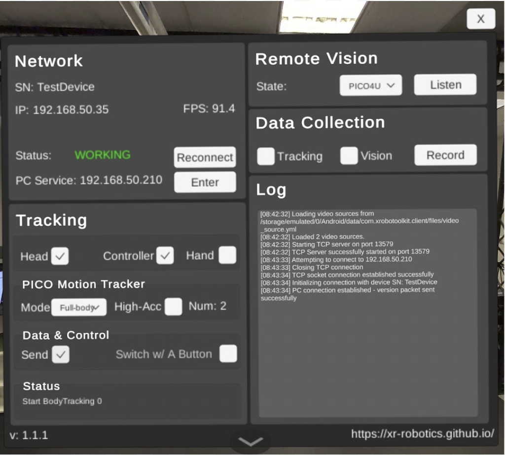 Open the XRoboToolKit application. Enter the IP address of the laptop by clicking “Enter” next to “PC Service:”. You will know it is properly connected if WORKING appears next to “Status:”.