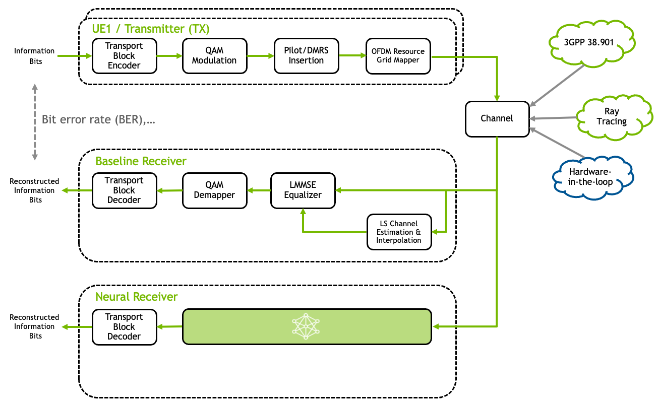 This tutorial demonstrates the integration of a neural receiver [Wiesmayr2024] for the 5G NR Physical Uplink Shared Channel (PUSCH) into the Sionna Research Kit. The core idea is to replace the conventional physical layer receiver signal processing - specifically channel estimation, equalization, and demapping—with a single neural network. Unlike classical receivers, this architecture operates on an entire 5G NR slot, jointly processing the full OFDM time-frequency resource grid to reconstruct the transmitted bits. For comprehensive background on neural receivers, please refer to the Sionna Neural Receiver Tutorial.